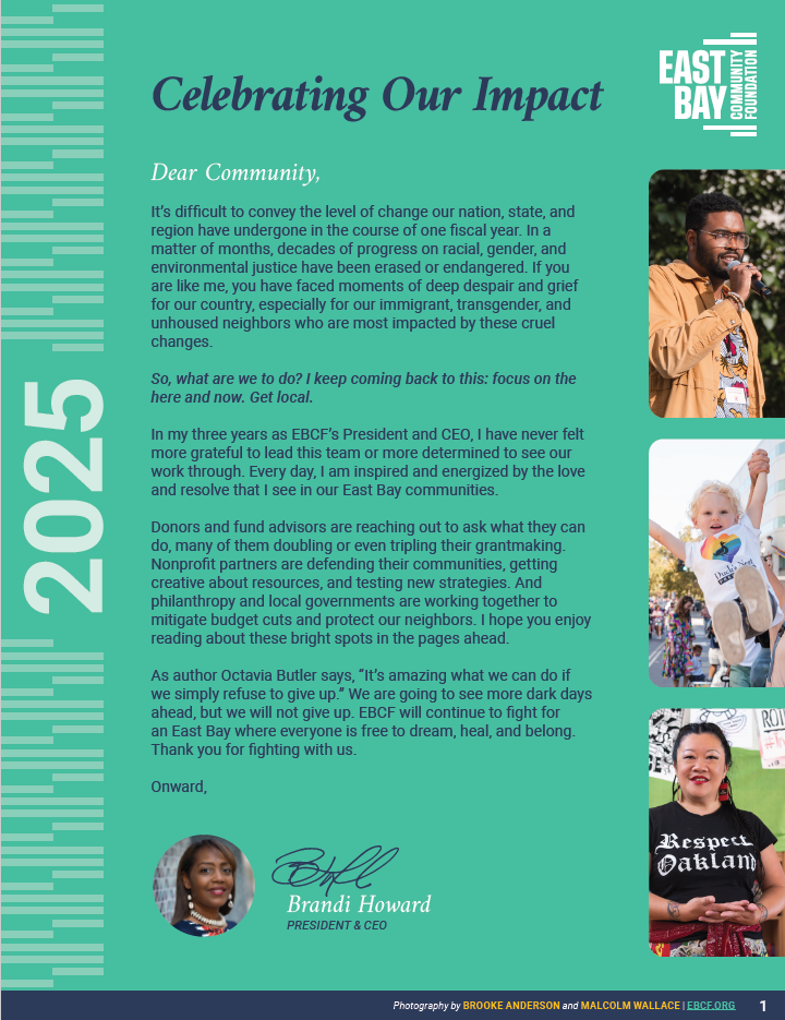 If you made a gift to EBCF last year, you helped make this work possible. Thank you from the bottom of my heart. Still, there’s much more to do, and we all have an important role to play. No matter what you’re doing to make life better here in the East Bay, we are grateful for your support and partnership.